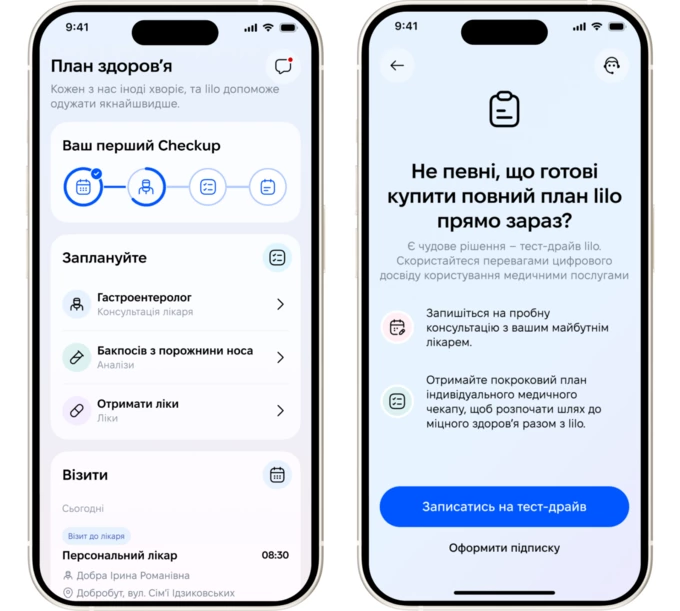 Під час тест-драйву в Lilo вам пропонують пройти загальний медичний скринінг організму, встановити особисті цілі й покрокову стратегію лікування та превентивних заходів, щоби поліпшити здоров’я й уникнути потенційних захворювань.