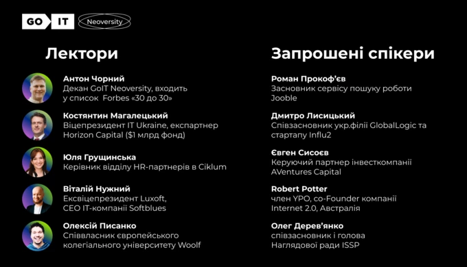 У GoIT Neoversity викладають практики з провідних IT-компаній глобальної індустрії, підприємці, засновники бізнесів і представники венчура, зокрема: