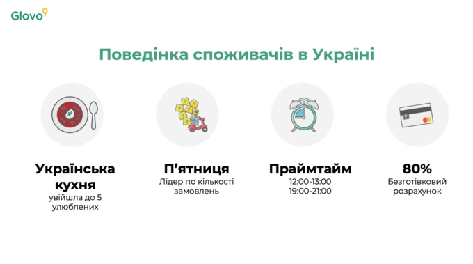 Серед особливостей українського ринку менеджмент Glovo виділяє, зокрема, перевагу обідніх замовлень над вечірніми. «В Україні обіди переважають над вечерями, хоча у світі, як правило, навпаки. Українці обід не пропускають», – коментує Марина Павлюк. Також виділяють високий показник безготівкових оплат – на рівні 80%.