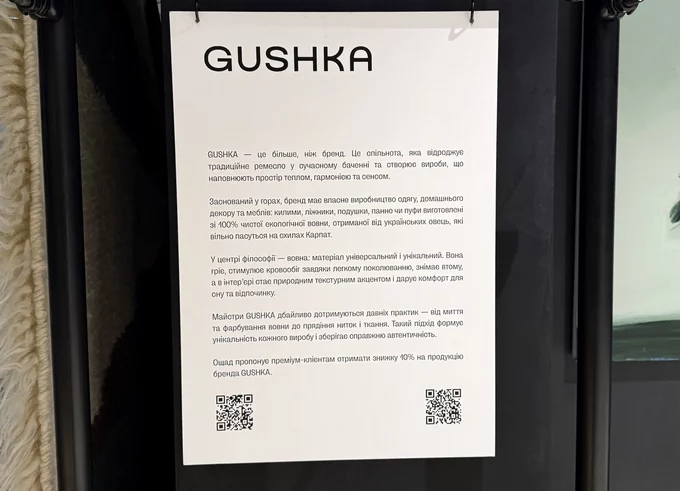 Gushka – українська мануфактура, яку у 2016 році в Косові заснували Олег Луканюк і Дарина Фурманюк. Команда бренду працює з вовною карпатських овець, що вільно випасаються на гірських схилах, а вироби створює вручну за понад столітніми технологіями ткацтва.
