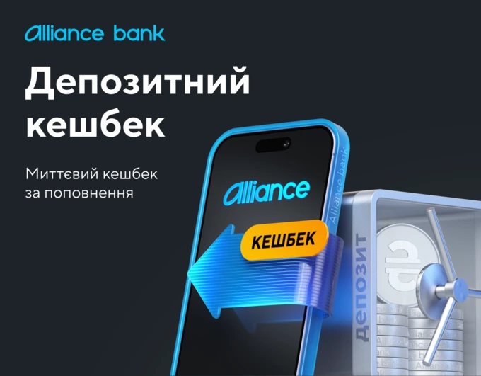 Alliance bank запустив акцію з кешбеком для гривневих депозитів. Поповнюйте депозит від 1 000 гривень й одразу отримуйте кешбек у розмірі 1,5% річних.