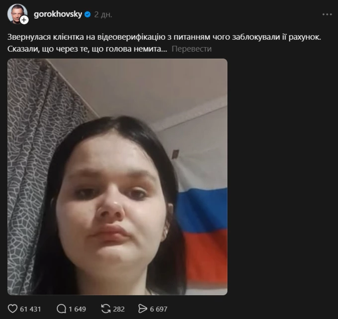 Національний банк України вимагає пояснень від Monobank після того, як його співзасновник Олег Гороховський поширив фото клієнтки нібито із прапором РФ та звинуватив її у проросійських поглядах.