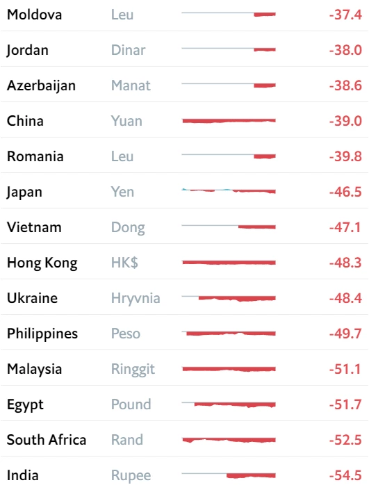 Для порівняння, у січні 2023 році українська гривня була недооцінена на 53,5%, як порівняти з доларом, у липні – на 49%. На початку 2022 року українська валюта була недооцінена на 58,1% щодо долара. Такі самі показники, як у 2022 році, гривня мала у 2020 році. У 2018 році українська гривня була найбільш недооціненою валютою у світі.