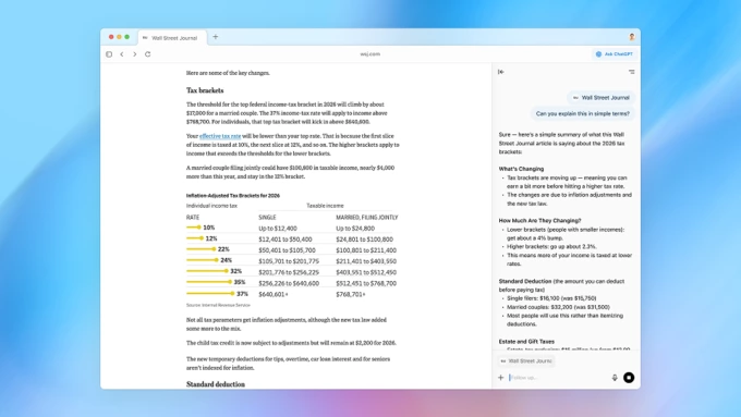 В Atlas можна попросити чатбота виконати завдання безпосередньо у браузері. Усі минулі розмови з ChatGPT синхронізуються, тож помічник спирається на цей контекст.