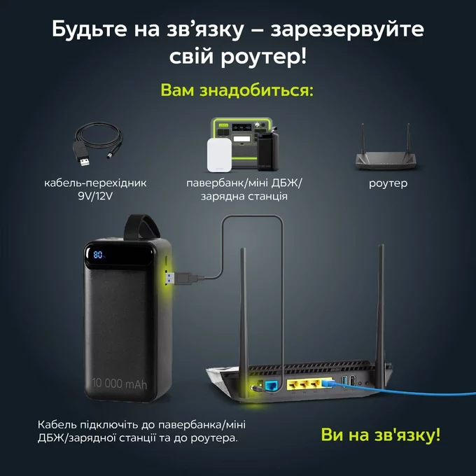 Це значить, що користувачі можуть підʼєднати свій роутер до резервного джерела живлення. Це може бути павербанк, безперебійник або зарядна станція.