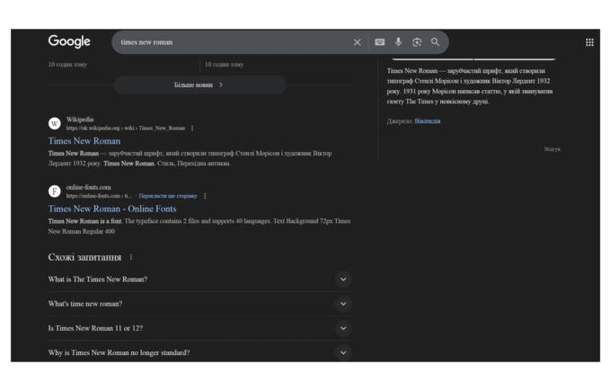 Цікавий факт: якщо загуглити “times new roman”, усі сторінки в пошуковику автоматично перейдуть на цей шрифт. Водночас з іншими шрифтами це не працює.