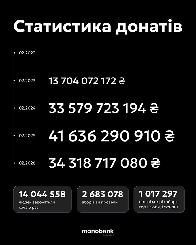 - за рік із лютого 2025-го до лютого 2026-го українці задонейтили 34,3 мільярда гривень.