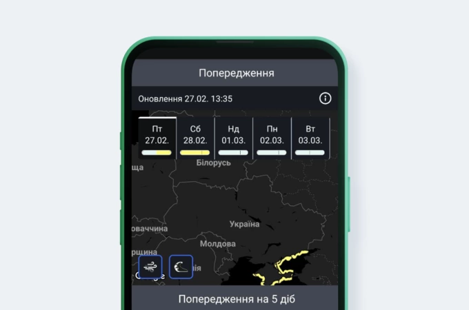 - погодинний і добовий прогноз погоди на п’ять діб