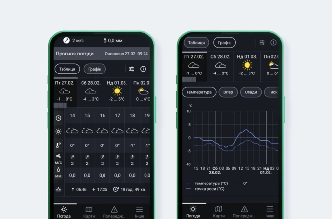 Прогноз погоди в застосунку показують у вигляді таблиці або графіків. Віледж