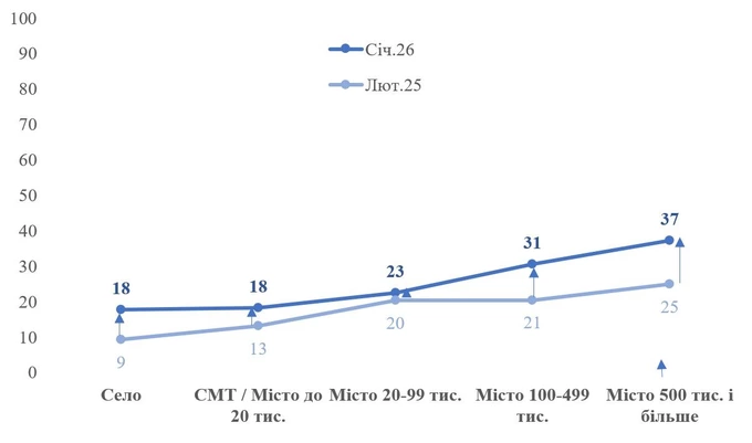У великих містах із населенням понад півмільйона нейромережами користуються приблизно вдвічі частіше, ніж у селах та невеликих містечках. Соціолог Володимир Паніотто зазначає, що загальний рівень поширення штучного інтелекту в Україні наразі порівнянний із показниками багатьох західних країн, де частка регулярних користувачів зазвичай становить від 20% до 30%.