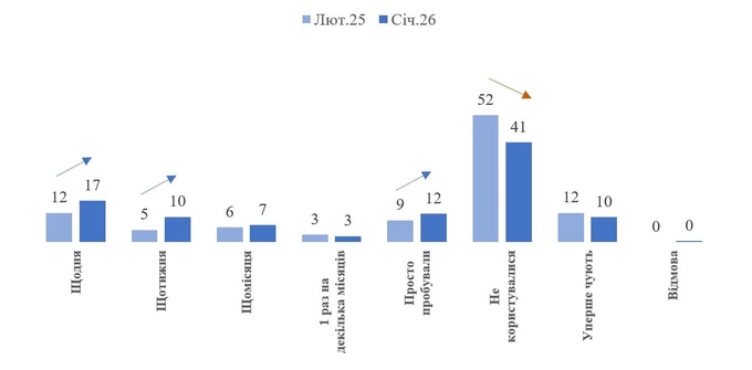 Якщо порівнювати з минулим роком, частка тих, хто користується нейромережами щонайменше раз на тиждень, зросла із 17% до 27%. Водночас кількість людей, які взагалі відмовляються від штучного інтелекту, потроху зменшується.