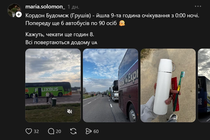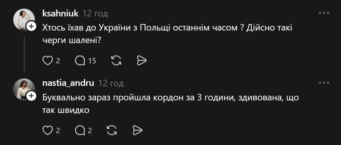 У Threads пишуть, що «пройшли кордон за 3 години», хоча пункти пропуску не вказують. Водночас на менш завантаженому «Грушів – Будомєж» люди стояли понад десять годин у черзі.