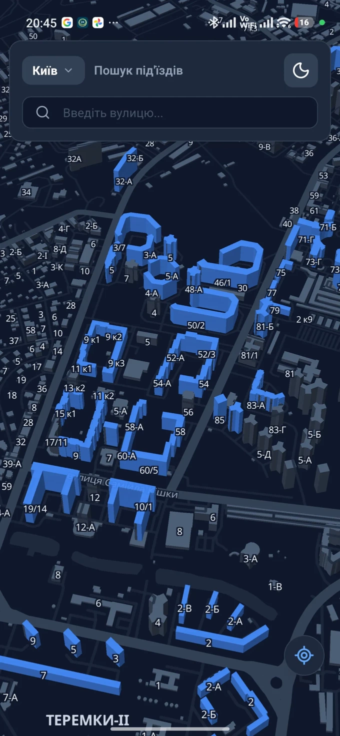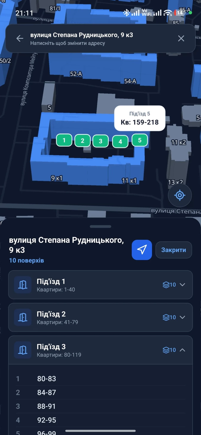 Застосунок працює на базі OpenStreetMap, тому відображає дані лише про Київ, Львів та Одесу. Це інтерактивна мапа, де користувач може натиснути на конкретний будинок, а застосунок покаже діапазон квартир у кожному під’їзді.
