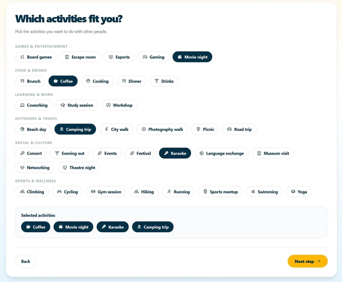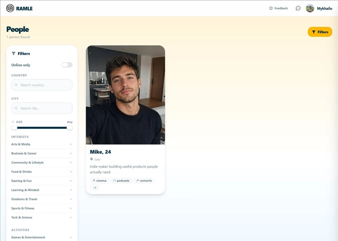 Це платформа лише для пошуку друзів – жодних натяків на дейтинг або нетворкінг. Тут немає свайпів, лайків чи фоловерів, тільки вибір занять, для якого ви шукаєте друзів. Фокус – не на профілі чи зовнішності, а на спільному заняття – «що робити разом, а не кого обрати», каже Савчук.