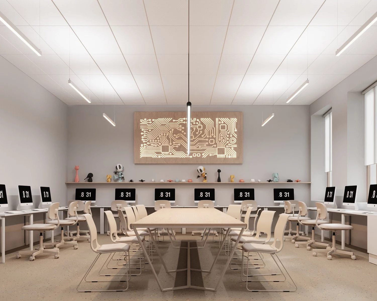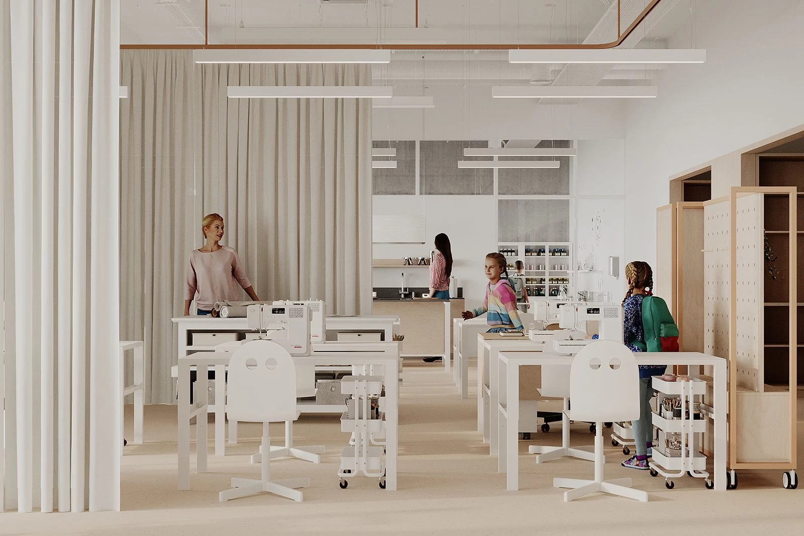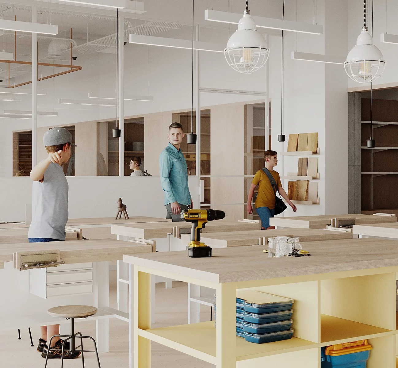 Простори із сучасними верстатами для роботи з деревом, металом і композитними матеріалами. Тут діти створюють прототипи роботів, меблів чи артоб’єктів, опановуючи практичну інженерію. Окремий напрям присвячений дизайну та шиттю: учні вчаться перетворювати власні ідеї на реальні вироби – від аксесуарів і колекцій одягу до конкурсних моделей і стартап-проєктів.