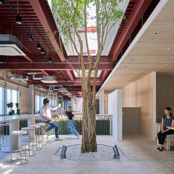 Усередині інтер’єр зробили мінімалістичним: нейтральні кольори, фанерні панелі й багато рослин, зокрема семиметровий фікус бенджаміна в центрі. Перший поверх відкрили для родин працівників і місцевих мешканців, а зовні облаштували парк із деревами та декоративною вазою.