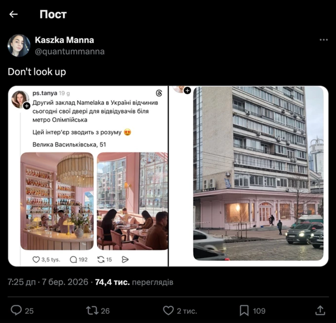 Друга кондитерська Namelaka почала роботу біля Київського національного академічного театру оперети 6 березня. Водночас у мережі зауважують, що фасад закладу буквально «зводить з розуму».