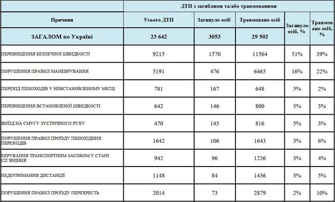 За рік сталося 23 462 ДТП із загиблими або травмованими. 3053 людини загинули, а 29 502 людини отримали травми. У Києві загинули 103 людини, а кількість смертельних аварій зросла на чверть, якщо порівняти з 2022 роком.
