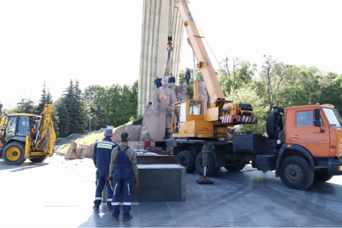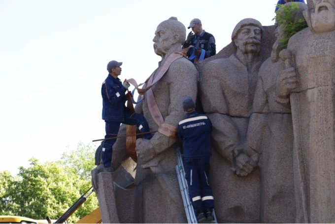 Радянську скульптуру двох робітників, встановлену як символ «возз’єднання України та Росії», демонтували 26 квітня 2022 року. Під час демонтажу в однієї з фігур відвалилася голова (мер Києва зазначив, що саме в робітника-росіянина). Щоб зняти памʼятник, довелося спиляли його основу, бо постамент не піддався. Другу скульптурну композицію, яка зображувала Переяславську раду, спочатку закрили опоряджувальними матеріалами, щоби розібрати згодом.