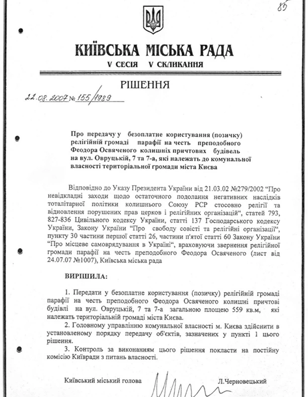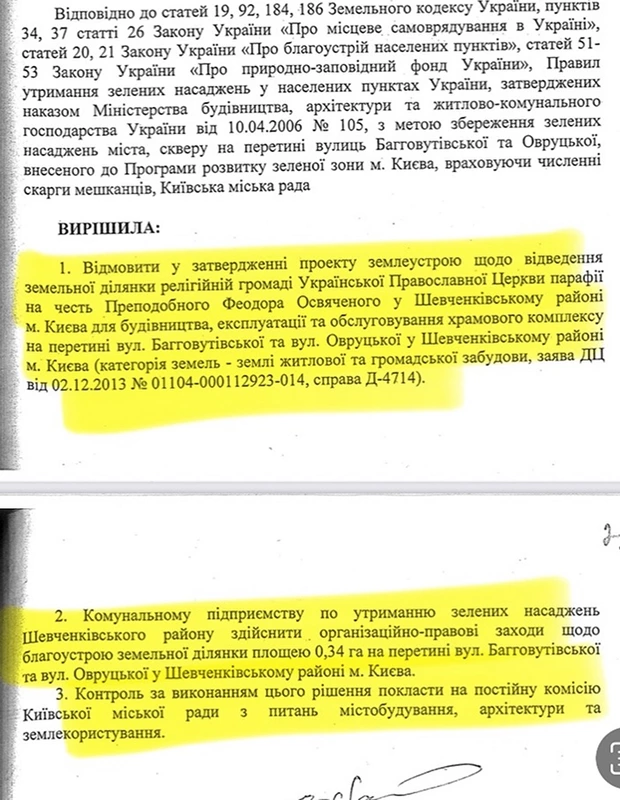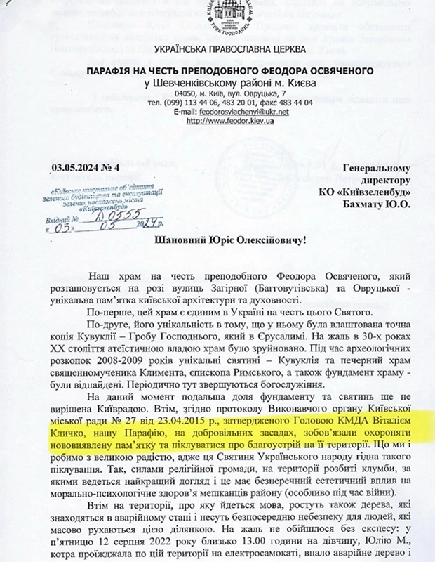 Семащук показує документ від 23 квітня 2015 року, де КМДА дозволяла «на добровільних засадах піклуватися про благоустрій» на цій території. А ще 22 серпня 2007 року тодішній міський голова Леонід Черновецький передав УПЦ МП будівлі на території скверу на вулиці Овруцькій, 7 і 7-А, яка належить громаді Києва.