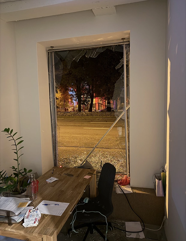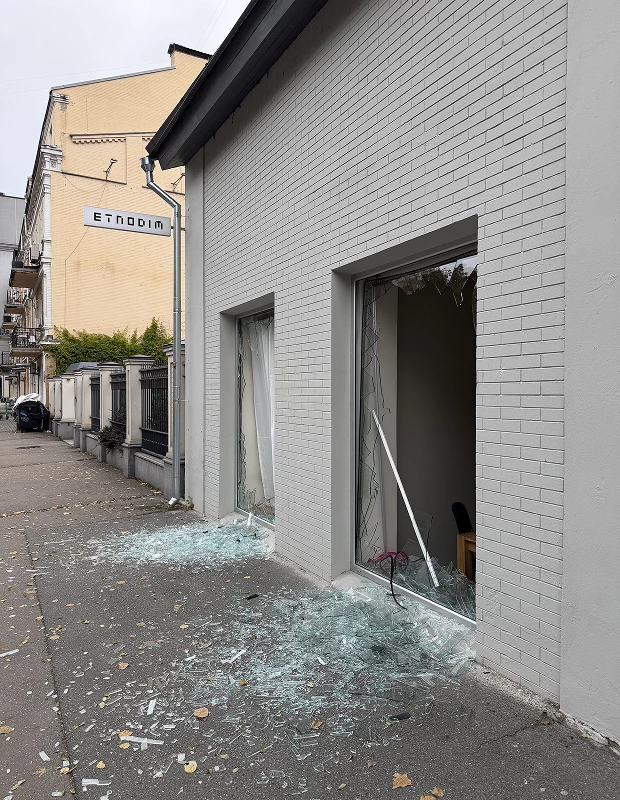Шоурум українського бренду Etnodim на Верхньому Валу, 58/28 пошкодили уламки дронів, повідомили Віледжу в команді.