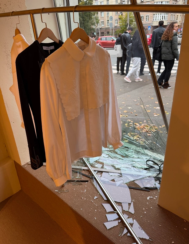 Там вибиті всі вікна, пошкоджений фасад і двері, освітлення, а також косметика всередині, однак вишиванки залишилися цілі. У шоурумі планують закрити вікна плитами ДСП і продовжити роботу, зазначили в команді.