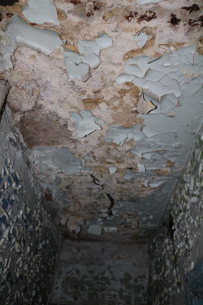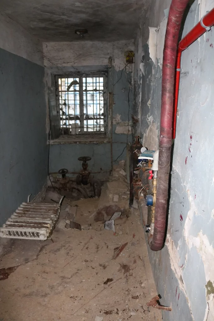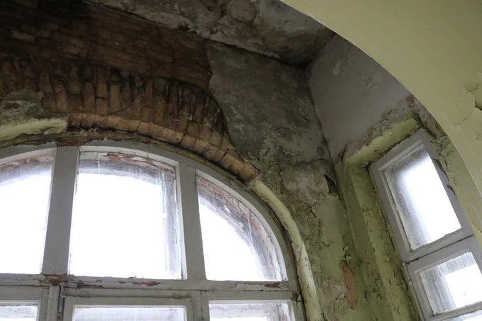 На фото видно, що всередині будівлі частково відпали шматки стелі та шматки штукатурки зі стін, полущилася фарба, пошкоджена підлога, а також є цвіль і грибок.