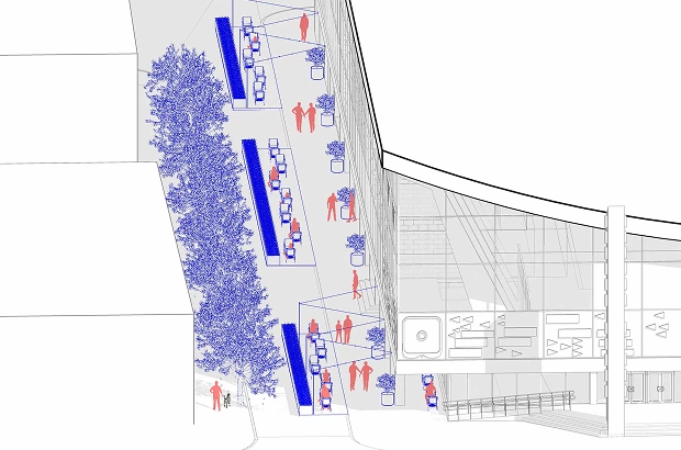 Перед ринком є транзитний тротуар із потрісканим асфальтом, де люди не зупиняються. Там пропонують створити громадський простір із лавками й зеленню. Також зробити зону Kiss & Ride [короткочасна зупинка для висадки або посадки пасажирів], щоб можна було швидко висадити пасажирів. Повноцінну парковку зробити неможливо, кажуть в команді, тому залишити авто радять на автостанції поряд.