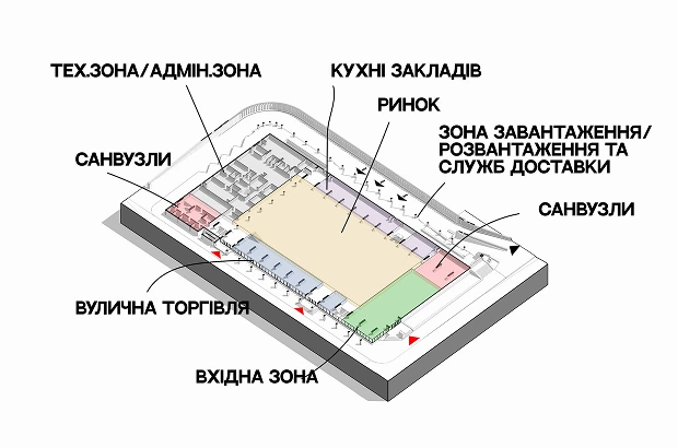 Основна функція залишається – продаж продуктів. Тут розмістять торгові ряди, адміністративні приміщення, кухні закладів, зону завантаження, розвантаження і служб доставки, оновлений санвузол. Біля входу облаштують навігацію й інформаційну стійку.