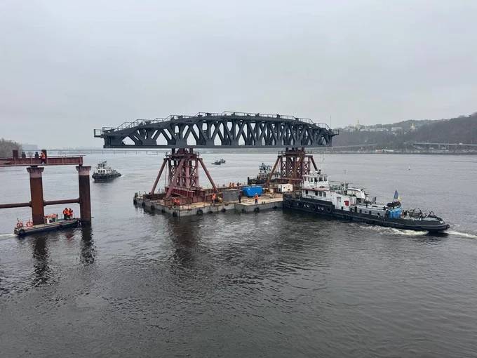 Перед цим у річище Дніпра занурили 160 паль на глибину близько 30 метрів. Вони слугуватимуть основою для металевих арок, які зібрали на спеціальному пірсі.