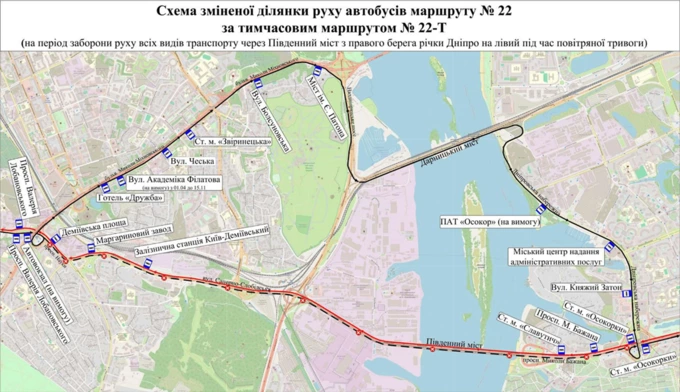 Під час повітряної тривоги автобус №22 курсуватиме за тимчасовими маршрутами під номерами 22-Д та 22-Т.