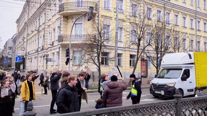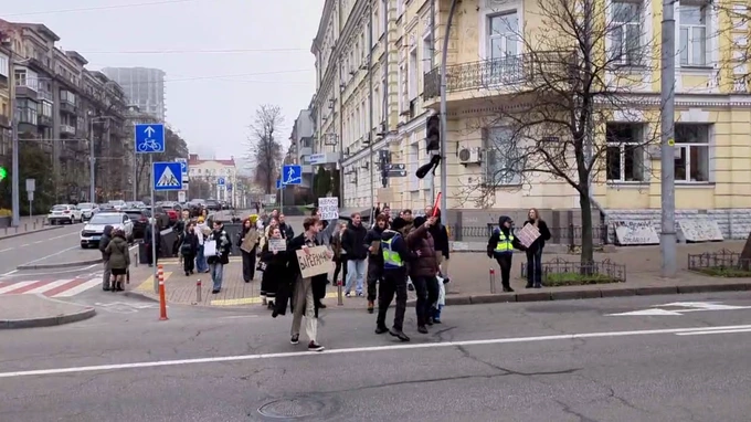 Протестувальники вийшли на акцію та вимагають облаштувати наземний перехід біля станції метро. Люди скандують «Поліція затвердь перехід!».