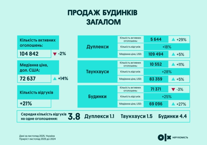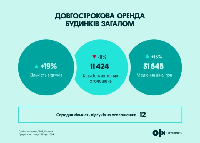 У 2025 році попит на оренду будинків зріс на 19%, при цьому на одне оголошення приходило в середньому 12 відгуків – один із найвищих показників. Кількість активних оголошень впала на 11%, що підняло середню ціну оренди по Україні на 13%.