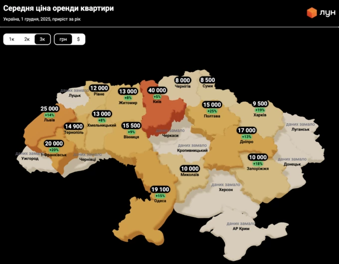 Найдорожчі 1-кімнатні – Ужгород (21,3 тисячі гривень/місяць), Львів (17 тисяч), Київ (16 тисяч), Івано-Франківськ майже наздогнав Київ. Найбільше зростання за рік показали Кропивницький (+33%) та Черкаси (+28%). 2-кімнатні подорожчали особливо в Ужгороді (+36%) та Чернівцях (+26%), 3-кімнатні в більшості міст майже без змін, але у Львові +14%, Одесі +15%, Івано-Франківську +20%.