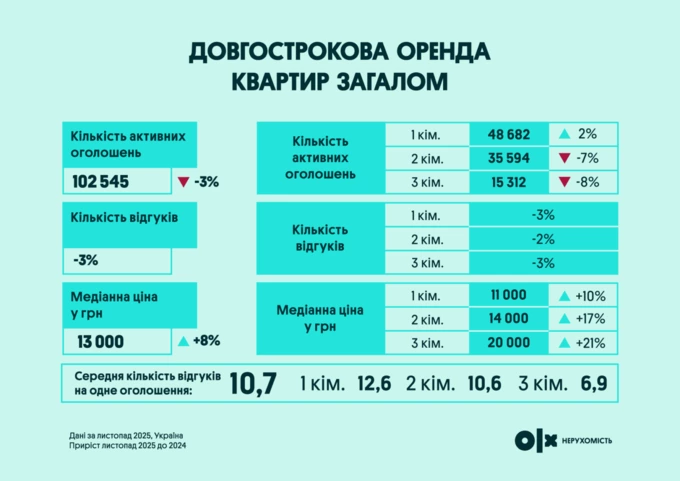 У 2025 році попит і пропозиція на довгострокову оренду квартир зменшилися на 3%. Водночас середні ціни по країні зросли на 8%.