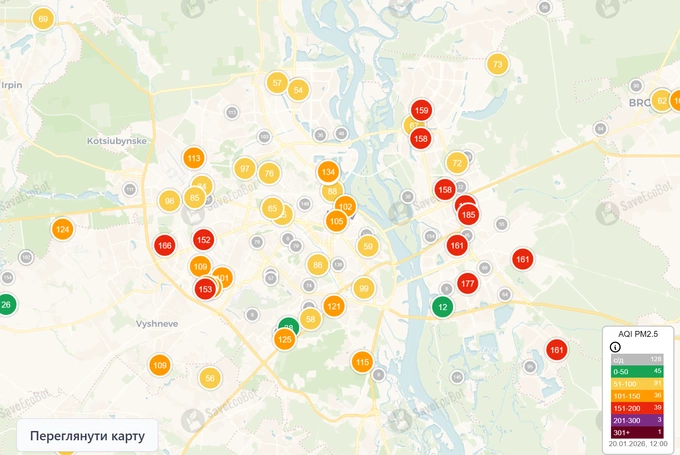 Найгірша ситуація на лівому березі Києва – там показники забрудненості повітря сягають значень 158–185, що свідчить про «шкідливий рівень». Показники в межах «шкідливого рівня» також фіксують у межах Софіївської та Петропавлівської Борщагівок, Гореничах і Борисполі.