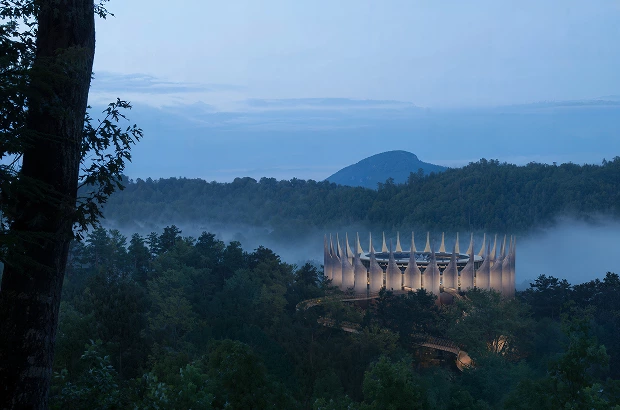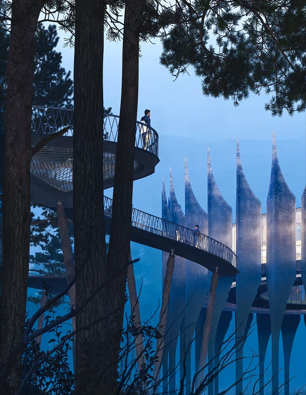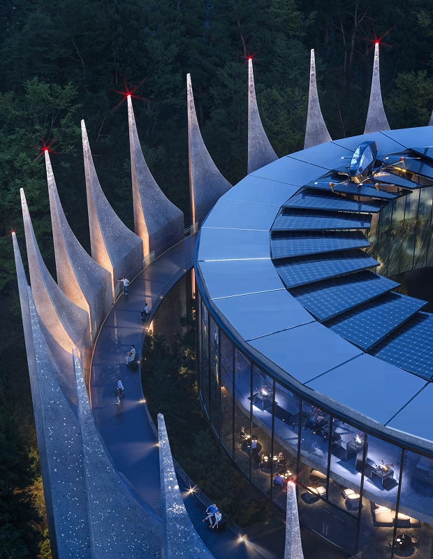 Зовнішню конструкцію зробили із суміші бетону та скла. Внизу переважає бетон, а ближче до верху з’являється більше скла, через що будівля поступово стає світлішою й напівпрозорою. Внутрішній простір станції – відкритий і панорамний, з краєвидом на гори.
