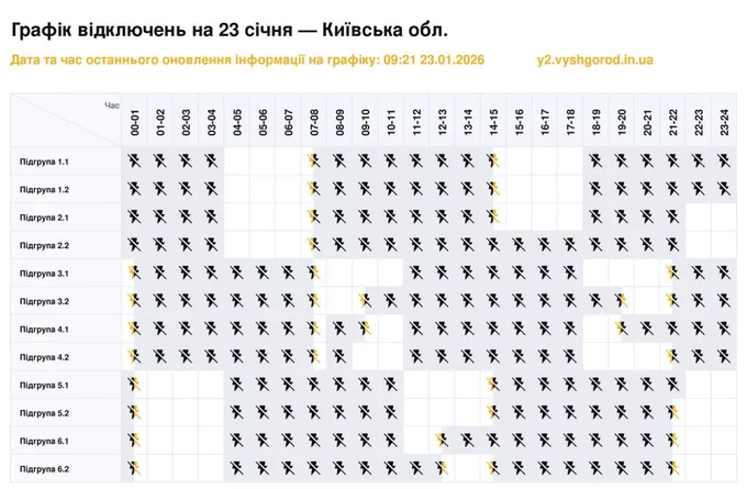 Востаннє графіки для Київщини компанія публікувала 15 січня. Тоді світла не було від 12 до понад 16 годин на день. Проте в деяких районах екстрені графіки діяли ще з 27 грудня 2025 року – через атаку росіян по енергетиці.