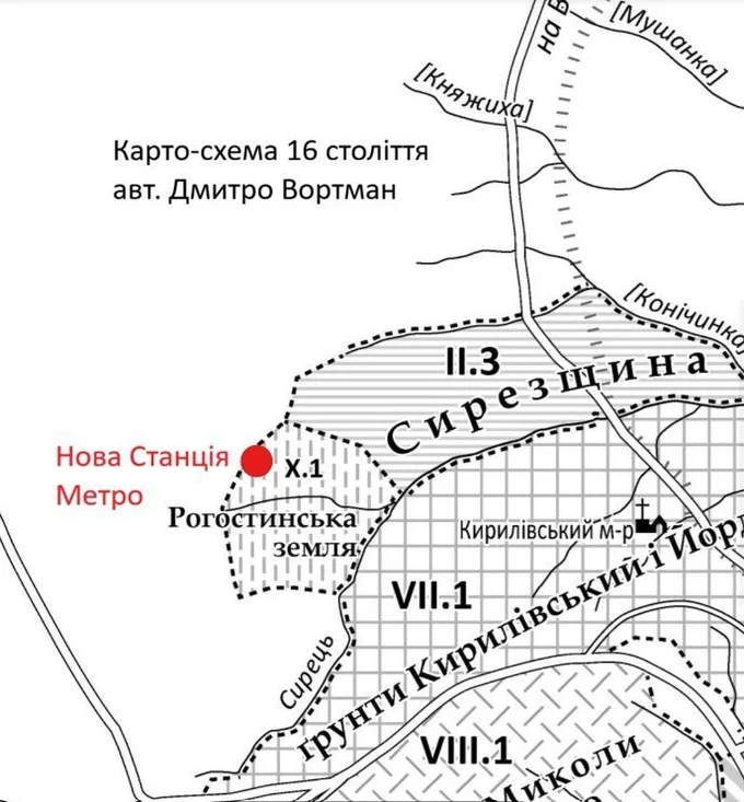 На карті 16 століття червоною крапкою активісти позначили місце станції Мостицька. «Пасажири Києва»