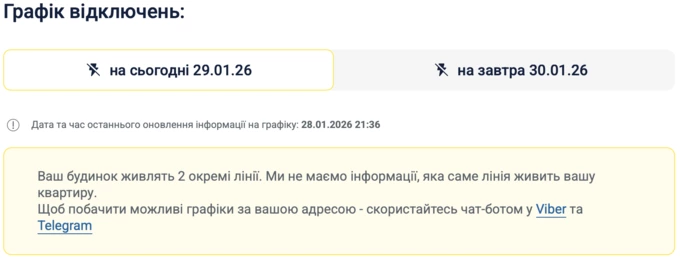 Графік можна подивитися на сайті ДТЕК та у застосунку «Київ Цифровий». Якщо будинок підключений до кількох ліній, найзручніше користуватися чат-ботами в Telegram і Viber – там можна дізнатися, до якої лінії під’єднана конкретна квартира.