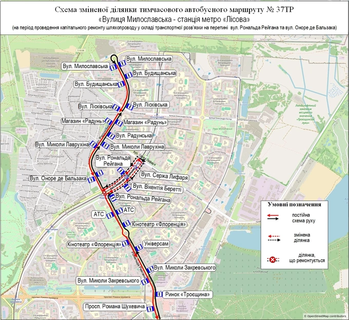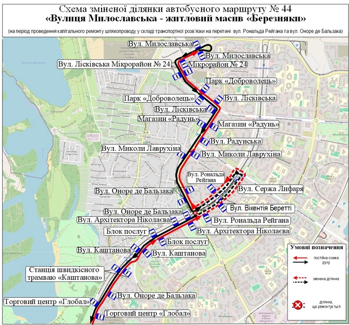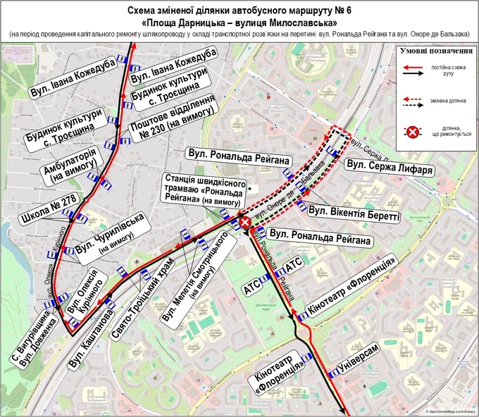 Маршрути руху змінять автобуси №6 та №44, а також тимчасовий автобус №37 ТР. Усі вони їхатимуть за своїми звичними маршрутами до шляхопроводу на перетині вулиць Рональда Рейгана та Оноре де Бальзака. Цю ділянку вони обʼїжджатимуть, а далі знову рухатимуться за звичними маршрутами.