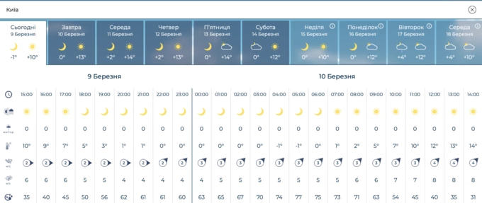 Прогноз погоди від Укргідрометцентру на тиждень 9-18 березня. Скриншот Віледжа