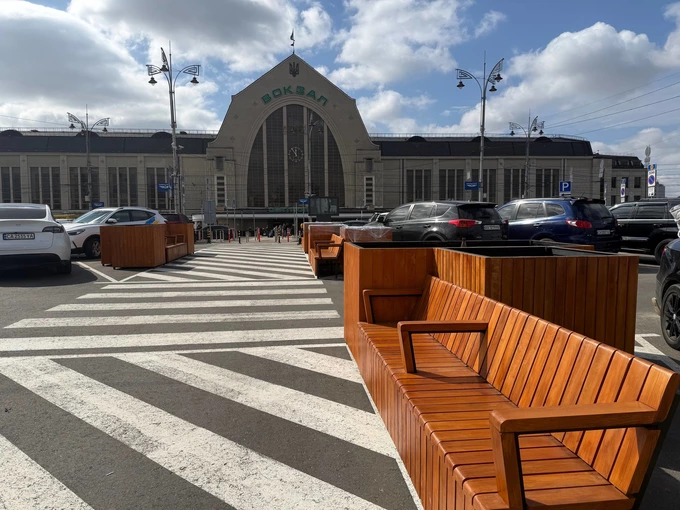 На паркінгу перед вокзалом зʼявилися десять парклетів. Це спеціальні вуличні меблі, які дозволяють пасажирам провести час на вулиці.