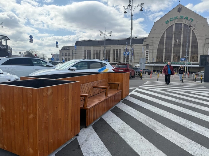 Перед Центральним вокзалом у Києві встановили вуличні меблі з озелененням, повідомляють у ГО «Пасажири Києва».