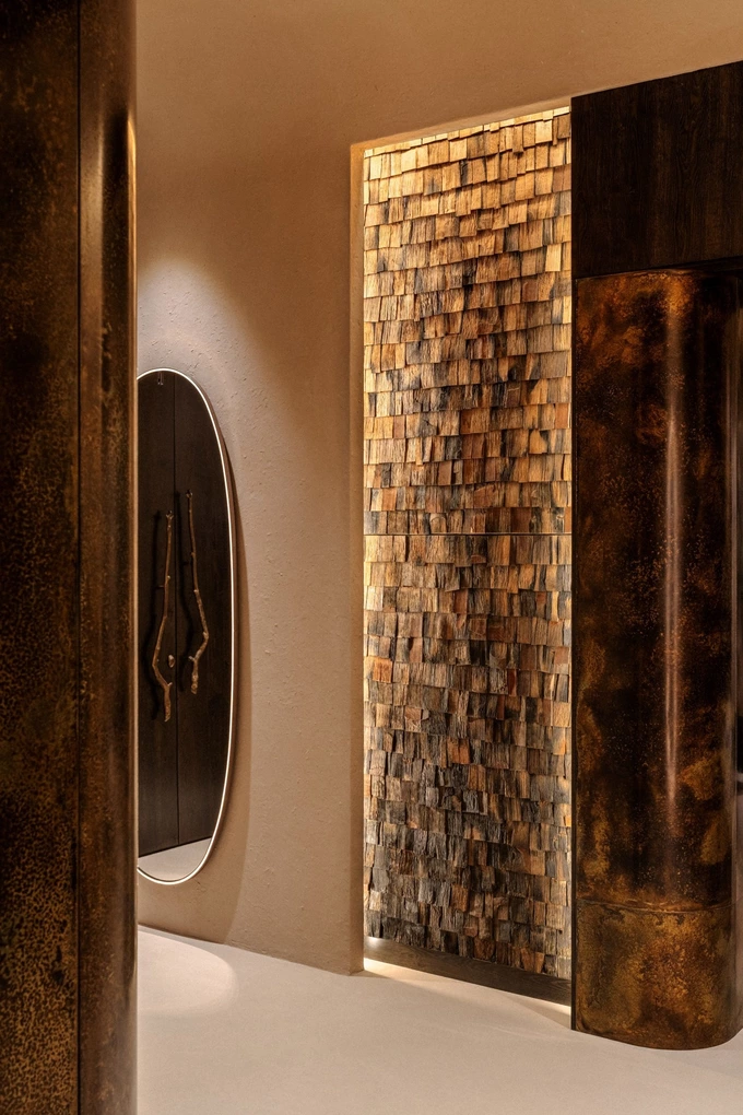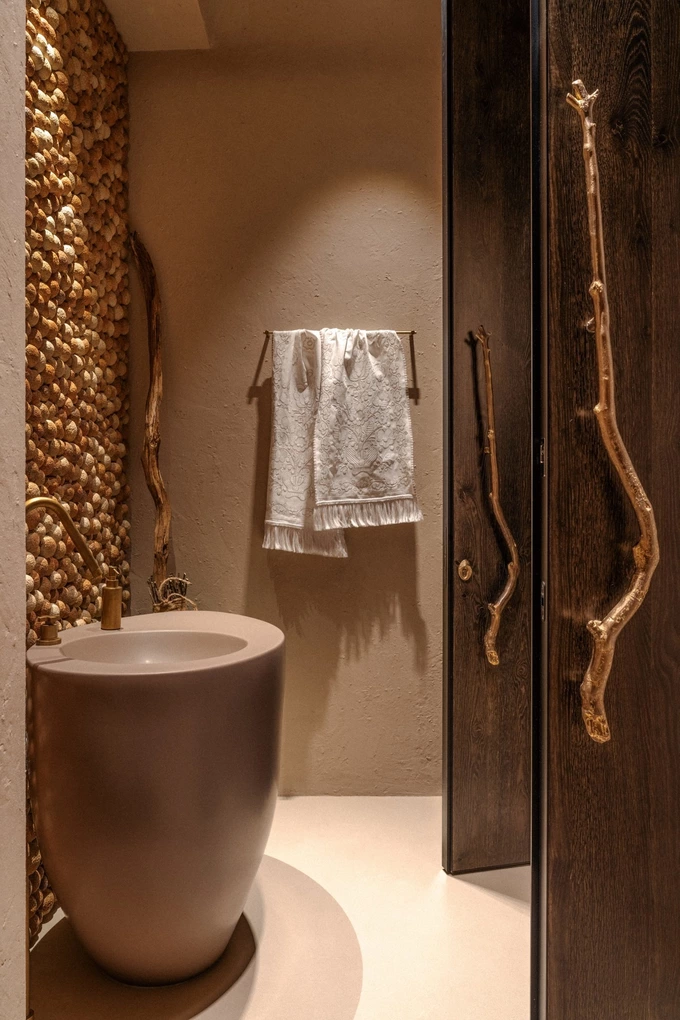 Двері та віконні рами зробили з тонованого дуба. Деякі двері доповнили бронзовими ручками у формі гілок від Philip Watts Design. У кабінеті власниці поставили письмовий стіл із кварциту секвої. Також там повісили створену спеціально для проєкту текстильну панель від Оксани Левчені.