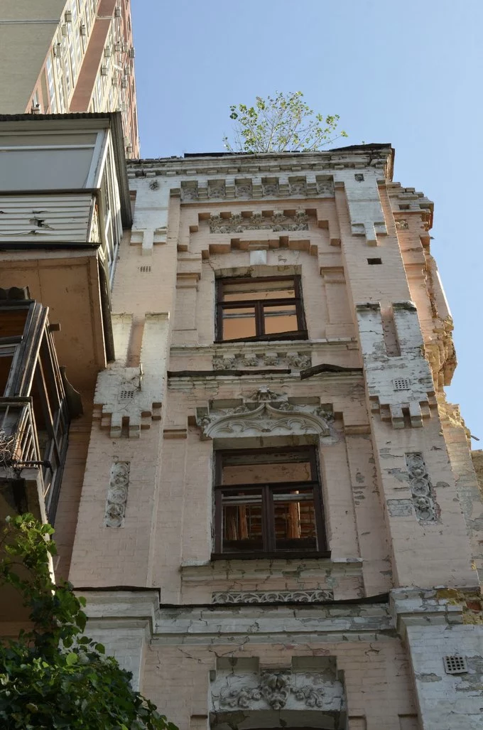 Фасад будинку на Жилянській, 116-А, рясно обплів виноград, а на тротуарі перед будинком, серед уламків цегли, віконних рам і скла, виросли квітучі чагарники. Це фактично й усі зміни, яких зазнала споруда відтоді, як у будинок влучив російський дрон. Атака сталася майже рік тому, 17 жовтня. З того часу жителі намагаються змусити КМДА відновити будівлю, чи принаймні визнати її такою, що підлягає відбудові.