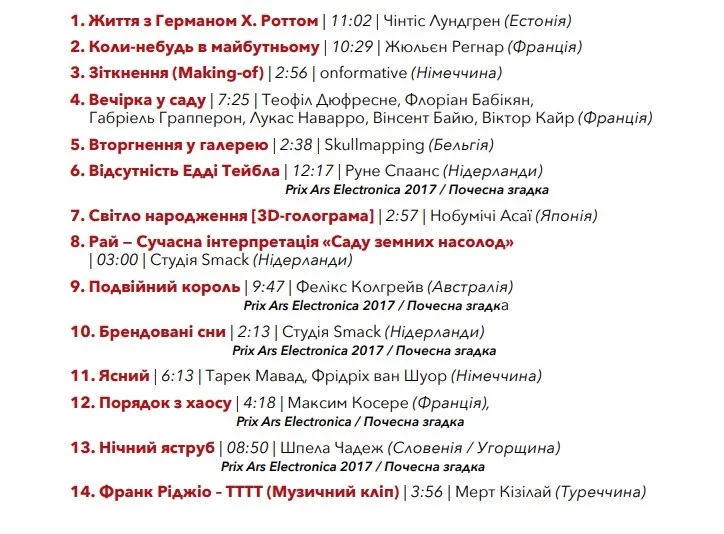 Колекція короткометражок, зокрема анімаційні стрічки, відеоарт, найкращі документальні та ігрові фільми австрійського фестивалю Ars Electronica 2017 у Лінці.