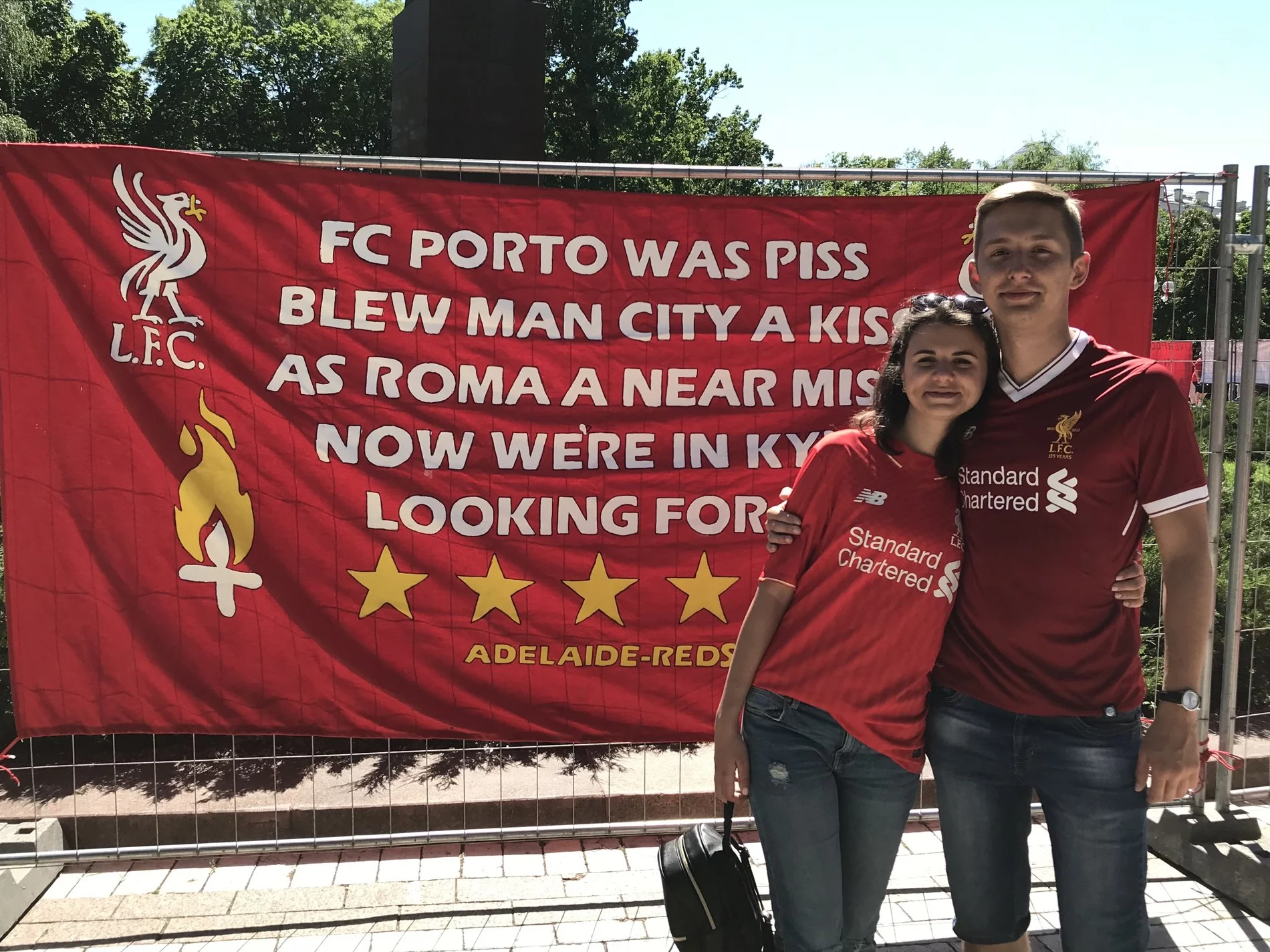 Зранку перед фіналом, 26 травня, у парку Шевченка почали збиратися вболівальники «Ліверпуля». Надвечір, перед грою на НСК «Олімпійський», їхня кількість перевалила за 10 тисяч: фанати приходили з червоними прапорами та намальованими від руки банерами, фаєрами й сумками, набитими пляшками з різними напоями, згадує кореспондент видання The Athletic.