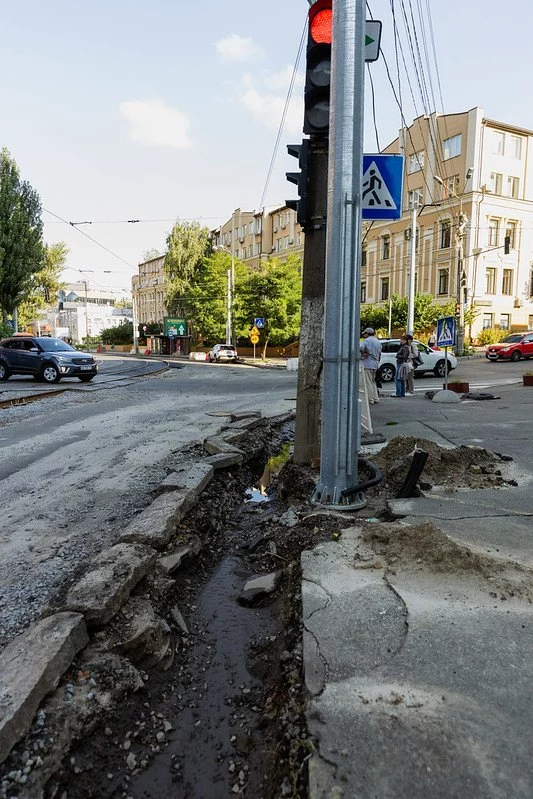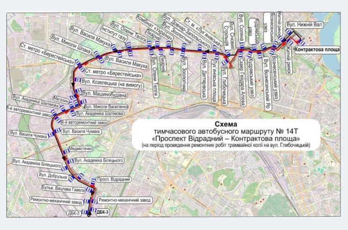 Через ремонт перекрили дорогу й рейки від Контрактової площі до вулиці Дмитрівської. На цей час закрили рух трамваїв №14 і №18, замість них курсує автобус №14Т від «Проспекту Відрадного» до «Контрактової площі».
