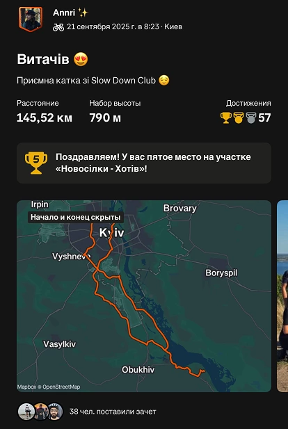 Анна каталася на велосипеді ще з підліткового віку, «але з’явилася робота, потім – переїзд до Києва, і якось стало не велосипеда». Роки два тому друзі Різниченко запросили її покататися околицями – Аня їздила на велосипеді свого знайомого, а у 2024-му купила власний. «Відтоді почала частіше їздити сама, знайомитися з іншими людьми й доєднуватися до велоклубів. Хоч велосипед не назву своєю рутиною, бо працюю з дому, а в будні виїзних справ мало, але катаюся щотижня», – ділиться дівчина.